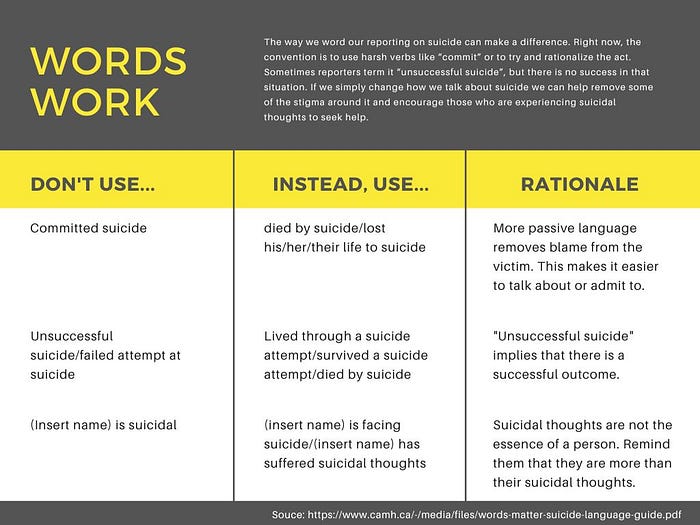 One way we can address this problem is to change how we talk about suicide. It’s a small battle to win in the war against self-harm, but it’s something we can do to minimize deaths by suicide. We also have to learn how to talk to those who experience suicidal ideation, because what we say in the moment matters.