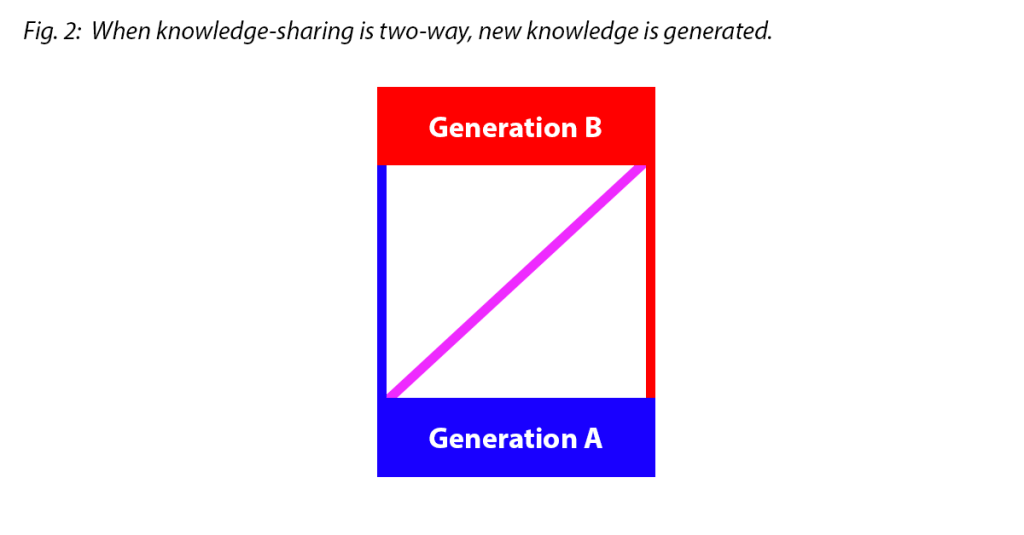 When the older Generation A simply sends its knowledge (the blue line) to the younger Generation B, we don’t really create much of a solid base. Everything is supported only by what Generation A knows.
