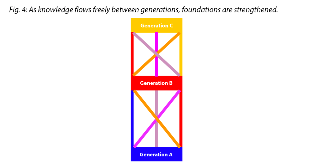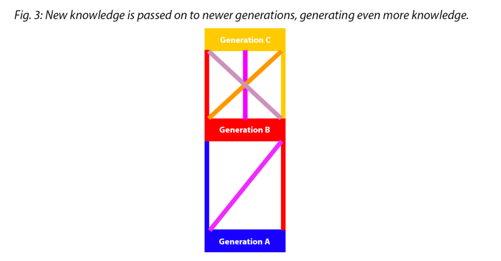 When Generation B starts sharing knowledge with the even younger Generation C, they pass on both their own knowledge and the new knowledge created with Generation A. This, in turn, creates two more new lines of knowledge (indicated here as the orange and mauve lines) that create a rock-solid knowledge base on their tiers.